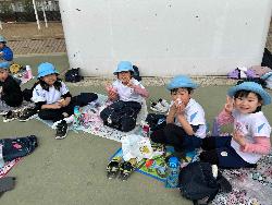 3歳児さんは内回りを、4・5歳児は、トラックを同じペースで音楽2曲分(7~8分)くらい、走りました。