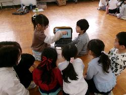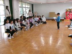 紙芝居で学校の図書室や体育の事など、学校のことを紹介してくれました。