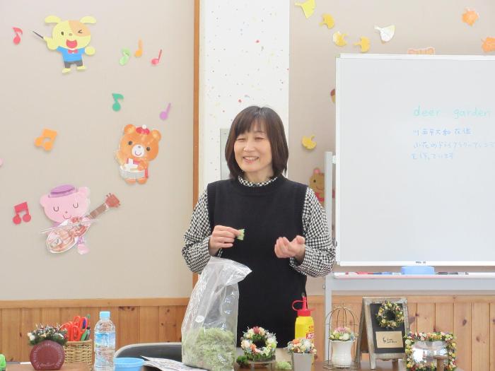 講師の島村さんから作り方のコツや気をつけることなどを教えていただきながら、ミニポットやミニリースに小花を飾り付けていきます。